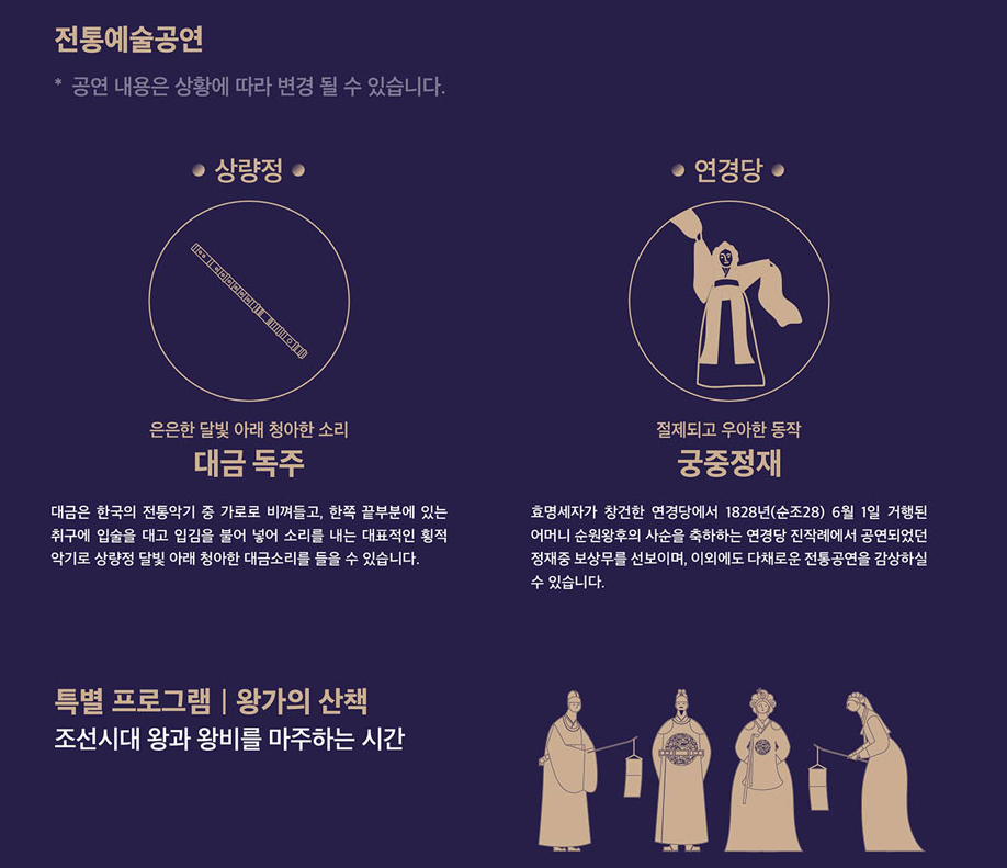 창덕궁을 거닐며 다채로운 왕실 이야기를 전문가의 해설로 듣는 달빛산책과 전통차를 곁들인 전통예술공연